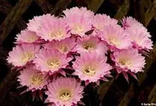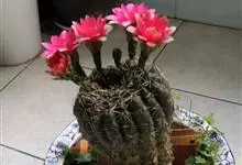 仙人球花 仙人掌科,仙人球属。植株单生或成丛。幼株球形,老株长成圆筒状,高可达75厘米,直径12-15厘米。球体暗绿色,具棱11-12。刺锥状,黑色,长1-1.5厘米。花着生于球体侧方,大型嗽喇叭状…全部>>