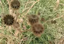 磨盘草 Sweet),又名:金花草、唐挡草。一年生成多年生、直立、分枝,亚灌木状草本,高0.5~2.5米,全部皆被灰色短柔毛。生于砂地、旷野或路旁。果为倒圆形似磨盘,直径约1.5厘米,黑色,…全部>>