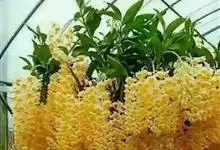 球花石斛,是兰科石斛属的多年生附生草本。茎直立或斜立,圆柱形,粗壮,基部收狭为细圆柱形,不分枝,具数节;叶互生于茎的上端,革质,长圆形或长圆状披针形;总状花序侧生于带有叶的老茎上端,下垂,花密生,黄色,…全部>>
