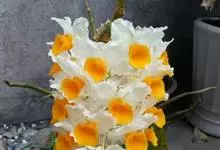 束花石斛是兰科石斛属植物。茎粗厚,肉质,下垂或弯垂,圆柱形,不分枝,具多节。叶二列,互生于整个茎上,纸质,长圆状披针形。伞状花序近无花序柄,每2-6花为一束,侧生于具叶的茎上部;花黄色,…全部>>