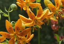 东北百合,别名卷莲花、老哇芋头、轮叶百合、伞蛋花、山丹花,为百合科、百合属多年生球根花卉。鳞茎卵圆形,白色,有节。苞片叶状,花淡橙红色,具紫红色斑点;花被片稍反卷,蒴果倒卵形,花期7-8月,果期9月,…全部>>
