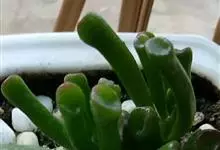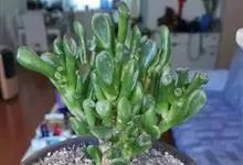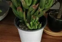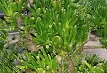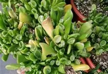 筒叶花月,是景天科青锁龙属的多年生草本植物。植株多分株,灌木状,茎较粗壮,圆柱形,表皮灰褐色;叶片肉质,互生,呈圆筒状,簇生于茎或分枝顶端,叶端呈斜截形,截面为椭圆形;花呈星状,淡白色;花期秋季。…全部>>