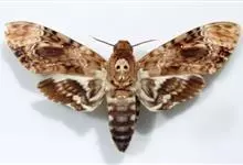 鬼脸天蛾,是鳞翅目天蛾科面形天蛾属动物。成虫翅展100~125毫米,体黑褐色;胸背有骷髅形斑纹;卵圆球形,直径约2毫米,淡黄绿色,表面光滑;老熟幼虫体长70~90毫米,蛹体长约56毫米;前翅为褐色,…全部>>
