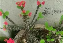 虎刺梅:别称铁海棠,是蔓生灌木植物。茎多分枝,长60-100厘米,直径5-10毫米,具纵棱,密生硬而尖的锥状刺,刺长1-1.5厘米,直径0.5-1.0 毫米,常呈3-5列排列于棱脊上,呈旋转。叶互生…全部>>
