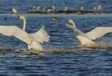 扁嘴天鹅:体长90-115厘米,体羽白色,羽端黑色,在飞行时则很明显。雁喙和脚红色。栖息于茂密的沼泽及湖泊,主要吃草及水生植物,也会吃蚌类及鱼类。分布于南美洲,…全部>>
