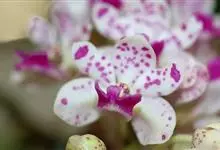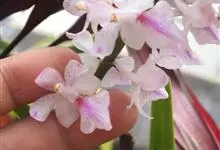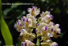 指甲兰是兰科指甲兰属植物。其茎粗壮;叶带状;总状花序疏生数朵花;萼片和花瓣淡白色,上部具紫红色;唇瓣侧裂片镰状长圆形;中裂片近宽卵形,前半部紫色,后半部白色带紫色斑点和条纹,先端凹缺,…全部>>