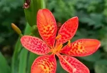 射干 Redouté)是鸢尾科射干属多年生草本植物。根状茎为不规则的块状,斜黄色或黄褐色;花橙红色,散生紫褐色的斑点;花药呈条形;子房下位,倒卵形;蒴果倒卵形或长椭圆形;种子圆球形,黑紫色,有光泽。…全部>>