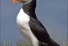 角海鹦:是鸻形目海雀科的鸟类,体重581-648克,体长约32厘米,翼展18-20厘米。是一种身体结实的鸟类,蹼脚、翅膀短,擅长游泳捕鱼,而在陆地上行走时则显得僵硬、步履蹒跚。有一张大嘴巴,呈三角形…全部>>