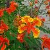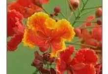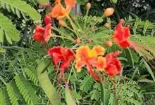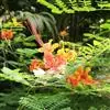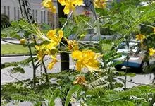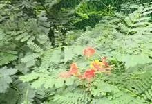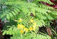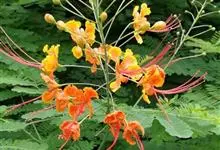 洋金凤 Sw.),豆科小凤花属灌木状或小乔木植物,枝无毛,绿或粉绿色;二回羽状复叶;总状花序伞房状,萼片无毛,花瓣橙红或黄色,圆形,花丝红色,子房无毛,花柱橙黄色;荚果窄而薄,…全部>>