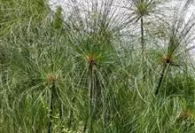 纸莎草是莎草科、莎草属的植物,具有粗壮的根状茎,高达2-3米,茎秆簇生,粗壮,直立,钝三棱形。叶退化呈鞘状,茎秆顶端着生总苞片,呈伞状簇生,总苞片叶状,披针形,顶生花序伞梗极多,细长下垂。瘦果灰褐色,…全部>>
