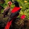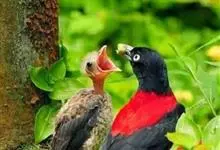朱鹂:中等鸟类,体长23-28厘米。雄鸟绛紫红色,头、上胸及翼黑色。雌鸟上背及背部深灰色,尾覆羽及尾绛紫红色,腹部及下胸白而密布黑色纵纹。与鹊色鹂幼鸟的区别在上背灰色较深,下体白色较少且纵纹较粗。…全部>>