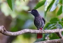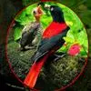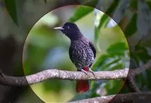 朱鹂:中等鸟类,体长23-28厘米。雄鸟绛紫红色,头、上胸及翼黑色。雌鸟上背及背部深灰色,尾覆羽及尾绛紫红色,腹部及下胸白而密布黑色纵纹。与鹊色鹂幼鸟的区别在上背灰色较深,下体白色较少且纵纹较粗。…全部>>