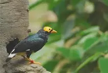 金冠树八哥为椋鸟科树八哥属的鸟类。体长约23厘米,闪辉黑色。特征为具翼斑及颏黄色,脸颊裸露皮肤粉黄色。分布于印度、缅甸、泰国以及中国大陆的云南、广东等地。…全部>>