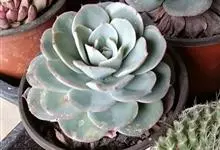 蓝石莲是景天科、拟石莲花属的多肉植物。茎部粗壮,成熟植株茎部木质化。叶片莲座型密集排列,株径不会很大,叶片相对较薄,常年绿色,表面布有白色粉末,中部凹陷,呈倒水滴状。叶尖较尖,叶缘光滑无褶皱,…全部>>