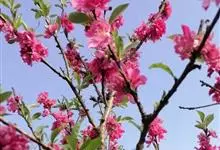 红叶碧桃是蔷薇科李属的一种落叶小乔木,是碧桃的一个变异品种。其小枝呈红褐色,单叶互生,叶片呈卵圆状披针型,在生长初期,叶子为鲜红色。花为重瓣状,呈桃红色。核果为球形,果皮周围有短的茸毛,并且内含蜜汁。…全部>>