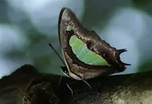 大二尾蛱蝶两翅正面黑色,中域有一浅绿色大型宽带纹,两翅反面浅绿色,中域有一缀黑边的褐色弧纹,亚外缘还有一深褐色横纹,后翅各有尾突两条,…全部>>