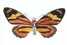 黑脉金斑蝶:翅阔8.6-12.4厘米。雄蝶较雌蝶为大。成年蝶颜色鲜艳,翅膀上有显眼的橙色及黑色斑纹,周围是宽阔的黑色边框,布有许多白色斑点。这种引人注目的着色是对捕食者的视觉警告,表示这个物种有毒;…全部>>