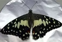 玉斑凤蝶Papilio helenus 别名白纹凤蝶,是凤蝶科凤蝶属美凤蝶亚属大型种类。雌雄同型;体翅皆黑色,后翅正面中室外有3个并列的白色斑,亚外缘有1列模糊的新月形红色斑,…全部>>