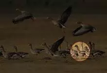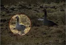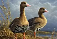 灰雁:体长70-90厘米,翼展147-182厘米,体重2.5-4千克,寿命17年。体大而肥胖。嘴、脚肉色,上体灰褐色,下体污白色,飞行时双翼拍打用力,振翅频率高。脖子较长。腿位于身体的中心支点,…全部>>