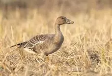 豆雁,雁形目鸭科。成鸟头、颈、背灰褐色,带淡黄色羽缘;尾上覆羽白色,尾羽黑褐色带白端,故飞行伸展时可见尾基和尾端各有一条白色弧线;翼上覆羽灰褐色,初级覆羽深黑灰色带黄白色羽缘,…全部>>