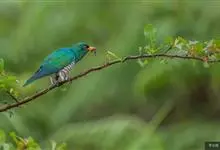 绿嘴地鹃:体形似小鸦鹃,但羽色大致绿灰;嘴绿色,头侧眼的周围有一裸区;后爪弯曲。虹膜赤红色,眼外周裸露皮肤繁殖期为赤红色,非繁殖期为暗红色。嘴绿色,基部及先端色暗,近嘴角处常沾红色,非繁殖期下嘴黄褐色,…全部>>