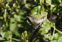 普通缝叶莺,是雀形目鹅科莺亚科缝叶莺属一种。体长10-14厘米,体重7-10克,雄鸟前额棕红,头顶至枕棕橄榄褐,上体橄榄绿染黄,飞羽及尾羽暗褐;繁殖期雄鸟的中央尾羽特形延长,下体淡皮黄白色。…全部>>