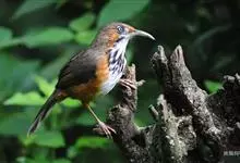 斑胸钩嘴鹛是雀形目、画眉科、钩嘴鹛属的鸟类。体型略大的钩嘴鹛。无浅色眉纹,脸颊棕色。甚似锈脸钩嘴鹛但胸部具浓密的黑色点斑或纵纹。栖息于低山地区及平原的林地灌丛间,在林间作短距离飞翔。…全部>>