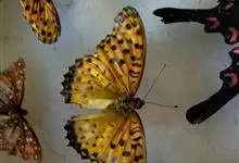 黑脉金斑蝶:翅阔8.6-12.4厘米。雄蝶较雌蝶为大。成年蝶颜色鲜艳,翅膀上有显眼的橙色及黑色斑纹,周围是宽阔的黑色边框,布有许多白色斑点。这种引人注目的着色是对捕食者的视觉警告,表示这个物种有毒;…全部>>