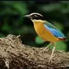 蓝八色鸫是雀形目八色鸫科的鸟类,体长约24厘米,体重109克左右。体型圆胖,尾短,腿长。羽色鲜艳,头顶两侧橘黄色的宽带延伸至颈背,宽宽的过眼纹黑色,脸颊皮黄,髭纹黑,尾亮蓝色。雌鸟较雄鸟色暗,…全部>>