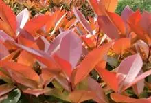 红叶石楠 是蔷薇科,石楠属杂交种,为常绿小乔木或灌木,乔木高可达5米、灌木高可达2米。叶片革质,长圆形至倒卵状、披针形,叶端渐尖,叶基楔形,叶缘有带腺的锯齿,花多而密,复伞房花序,花白色,梨果黄红色,…全部>>