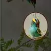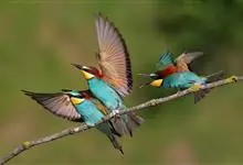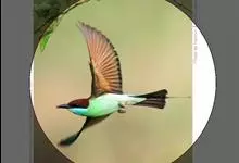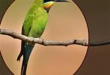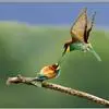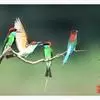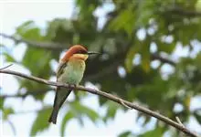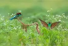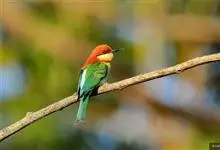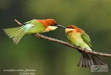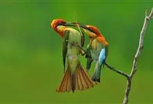 栗喉蜂虎是蜂虎科蜂虎属的鸟类。有热带鸟类羽毛艳丽的特征:喉部是栗红色的,黑色的过眼纹,翅膀和背部是绿色的,尾翼是蓝色的,飞行时翅膀下面的羽毛是橙黄色的,在阳光的照射下,它们全身闪烁着金属般的艳丽光泽,…全部>>