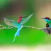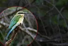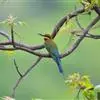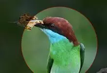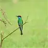 蓝喉蜂是蜂虎科蜂虎属鸟类。体长26-28厘米,嘴长而弯曲,有明显细长的中央尾羽。头部、颈部和背部为巧克力色,有黑色眼纹。喉部、腰部和尾羽为蓝色。腹部和两翼为绿色。幼鸟外观似成鸟,头部、颈部和背部为绿色,…全部>>
