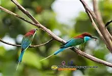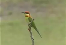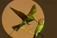 栗喉蜂虎是蜂虎科蜂虎属的鸟类。有热带鸟类羽毛艳丽的特征:喉部是栗红色的,黑色的过眼纹,翅膀和背部是绿色的,尾翼是蓝色的,飞行时翅膀下面的羽毛是橙黄色的,在阳光的照射下,它们全身闪烁着金属般的艳丽光泽,…全部>>