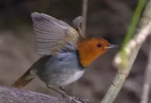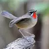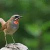 红尾歌鸲:体长13-15厘米。上体橄榄褐色。尾羽棕栗色,眼先和颊黄褐色,眼周淡黄褐色。下体颏、喉污灰白色,微沾皮黄色,胸部具橄榄色扇贝形纹,两胁橄榄灰白色,腹部和尾下覆羽与颏、喉同。尾部棕色。…全部>>