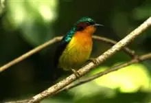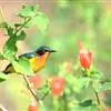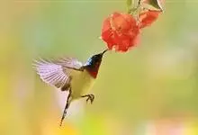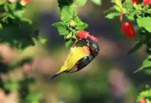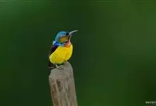 绿喉太阳鸟:共有9个亚种。小型鸟类,雄鸟体长13-15厘米、雌鸟10-12厘米。雄鸟前额至后颈、颏和喉辉绿色,头侧黑色,颈侧和背暗红色,两肩、下背橄榄绿色,腰鲜黄色,尾上覆羽和中央尾羽暗绿色,…全部>>