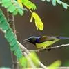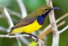 黑胸太阳鸟:小型鸟类,体长9-15厘米。嘴细长而向下曲。雄鸟中央尾羽特长,尾呈楔形,头顶至后颈紫蓝色具金属光泽;背褐红色,腰有一黄色横带,尾上覆羽和尾紫蓝色;颏、喉和上胸乌黑色,有的下胸为硫黄色,…全部>>