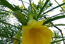 黄花夹竹桃K. Schum.),又名“酒杯花”“柳木子”“黄花状元竹”,是夹竹桃科,黄花夹竹桃属下的常绿乔木植物。高达5m,全株无毛,树皮棕褐色;叶互生,近革质,线形或线状披针形;花大,黄色,具香味,…全部>>