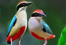 绿胸八色鸫:是雀形目八色鸫科的鸟类,共有12个亚种。体长为16-18厘米,体重65-69克。体型圆胖,尾短,腿长。头黑,上体绿色,两翼深色而具白色斑纹,头顶至后枕深褐,胸及腹部苹果绿,臀亮红。…全部>>