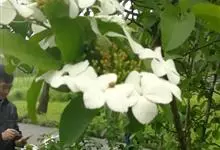 琼花是荚蒾科荚蒾属落叶或半常绿灌木植物,又名扬州琼花、蝴蝶木、八仙花、聚八仙、蝴蝶戏珠花、毛琼花。琼花高达4米;树皮灰褐色或灰白色。叶纸质,卵形至椭圆形或卵状矩圆形。聚伞花序,花冠白色,辐状。…全部>>