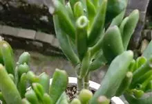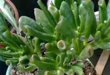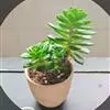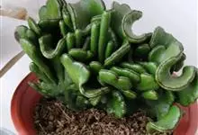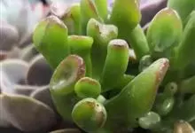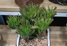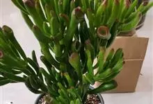 筒叶花月,是景天科青锁龙属的多年生草本植物。植株多分株,灌木状,茎较粗壮,圆柱形,表皮灰褐色;叶片肉质,互生,呈圆筒状,簇生于茎或分枝顶端,叶端呈斜截形,截面为椭圆形;花呈星状,淡白色;花期秋季。…全部>>
