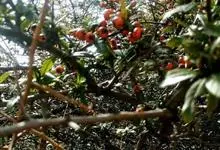 火棘 H. L. Li)是蔷薇科火棘属常绿灌木,老枝呈暗褐色;叶片呈倒卵形,边缘有钝锯齿,齿尖向内弯,两面皆无毛;叶柄短,无毛或嫩时有柔毛;花序是复伞房状,花瓣呈白色近圆形;果球近圆形,…全部>>
