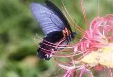 蓝凤蝶,Papilio protenor Cramer,凤蝶科凤蝶属的一种昆虫。翅展95~120mm。翅黑色,有靛蓝色天鹅绒光泽。雄蝶后翅正面前缘有黄白色斑纹,…全部>>