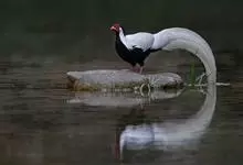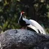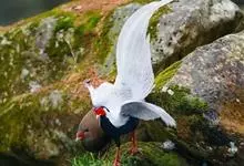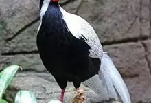 白鹇,是鸡形目雉科鹇属的一种留鸟。雄鸟上体白色并具黑色纹,下体黑色,头顶具黑色长羽冠,尾白而长;雌鸟体型较小,以橄榄褐色为主,下体具白色或皮黄色细纹;虹膜褐色,眼周具红色裸皮,喙黄色,脚鲜红色。…全部>>