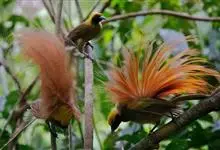 大极乐鸟是极乐鸟属中最大的鸟种。成年雄鸟体长可达到43厘米,雌性可达35厘米。雄鸟的额、颊、喉等墨绿色;头、颈黄色;上体暗赤栗色;腹部葡萄红色,胁部有长饰羽,其基部橙黄,中部黄色,…全部>>