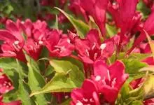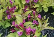 红王子锦带花是忍冬科锦带花属的落叶开张性灌木。株高1 -2米;嫩枝淡红色,老枝灰褐色;单叶对生,呈椭圆形,先端渐尖,叶缘有锯齿,红枝及叶脉具柔毛;花冠漏斗状钟形,花冠筒中部以下变细,聚伞花序,…全部>>