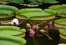 王莲:是睡莲科王莲属植物统称。多年生或一年生大型浮叶草本,有直立的根状短茎和发达的不定须根,白色。拥有巨型奇特似盘的叶片,浮于水面,十分壮观,并以它娇容多变的花色和浓厚的香味闻名于世。夏季开花,单生,…全部>>