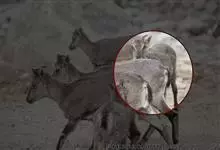 岩羊是偶蹄目牛科岩羊属哺乳动物。颜色与岩石相像,两性皆具角,雄羊角大而弯曲,角外表具不明显的横棱且体壮实,雌羊角短小;头较小,眼大,耳小,颏下无须;体背面为棕灰或石板灰色略有蓝色反光,…全部>>