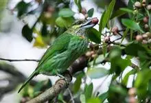 绿拟啄木鸟为鴷形目,须科,拟啄木属的一种。形较大拟啄木鸟略小,体长约260mm。头、颈及胸浅褐而具淡黄白色条纹;喉几为淡黄白色;身体余部草绿色。虹膜棕褐色,眼周裸露部黄色;嘴峰角黄色;跗跖和趾角黄…全部>>