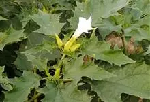 曼陀罗,茄科曼陀罗属一年生大型草本植物,全株光滑。有臭气;叶呈广卯形,边缘具不规则波状浅齿裂;花单生于枝杖间或叶腋,直立,有短梗;花萼是筒状裂片三角形,颜色为白色或淡紫色;果实为蒴果卵状,…全部>>