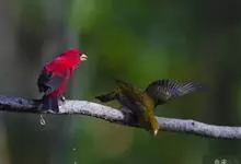 普通朱雀是雀形目雀科朱雀属鸟类,又名红朱雀、马料、青麻料。雄鸟上体红色,下体淡红色;头部、喉部、胸部及腰部亮红色;背部褐色染红色;两翼及尾黑褐色,羽缘染红色。雌鸟上体橄榄褐色,下体近白色,…全部>>